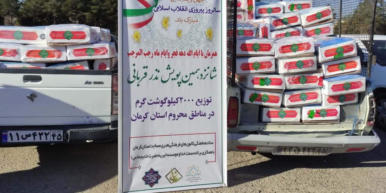 پويش نذرقرباني، با توزيع 1200 بسته گوشت ميان نيازمندان شهرستانهاي کرمان ، رفسنجان ، بافت ورابر با همت بچه هاي مسجد اجرا شد.